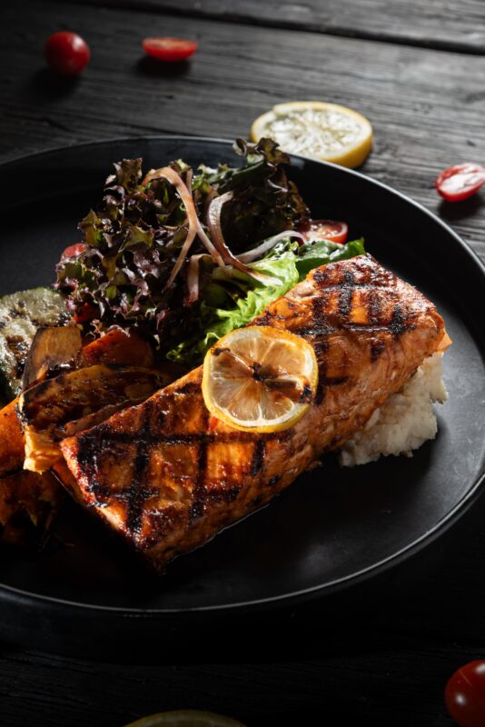 Lonja de salmón cocinado a la parrilla, marinado en nuestra salsa zarandeada, con guarnición de verduras a la parrilla, ensalada de temporada.