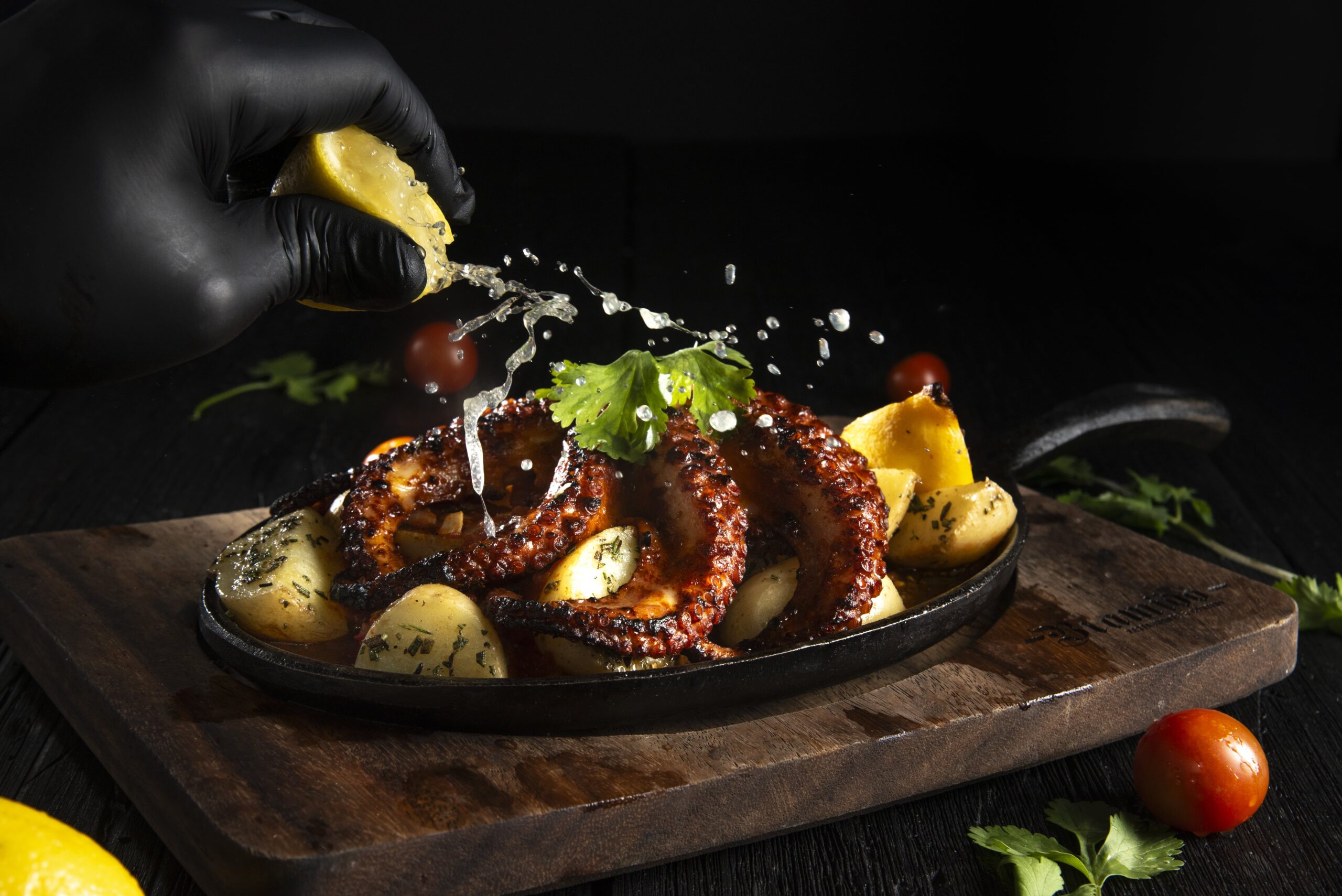 Pulpo baby perfectamente cocido y parrillado en adobo de zarandeado, con papitas cambray cocidas al dente, y salsa pomodoro casera.