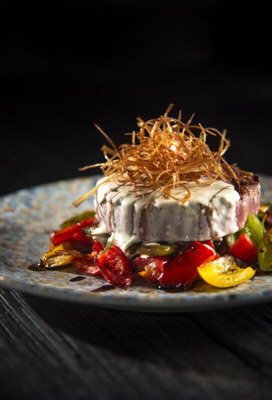 Atún sellado al grill en una cama de pimientos sazonados con chimichurri y mantequilla, flameado al tequila, bañado en salsa cremosa de limón y coronado con poro frito