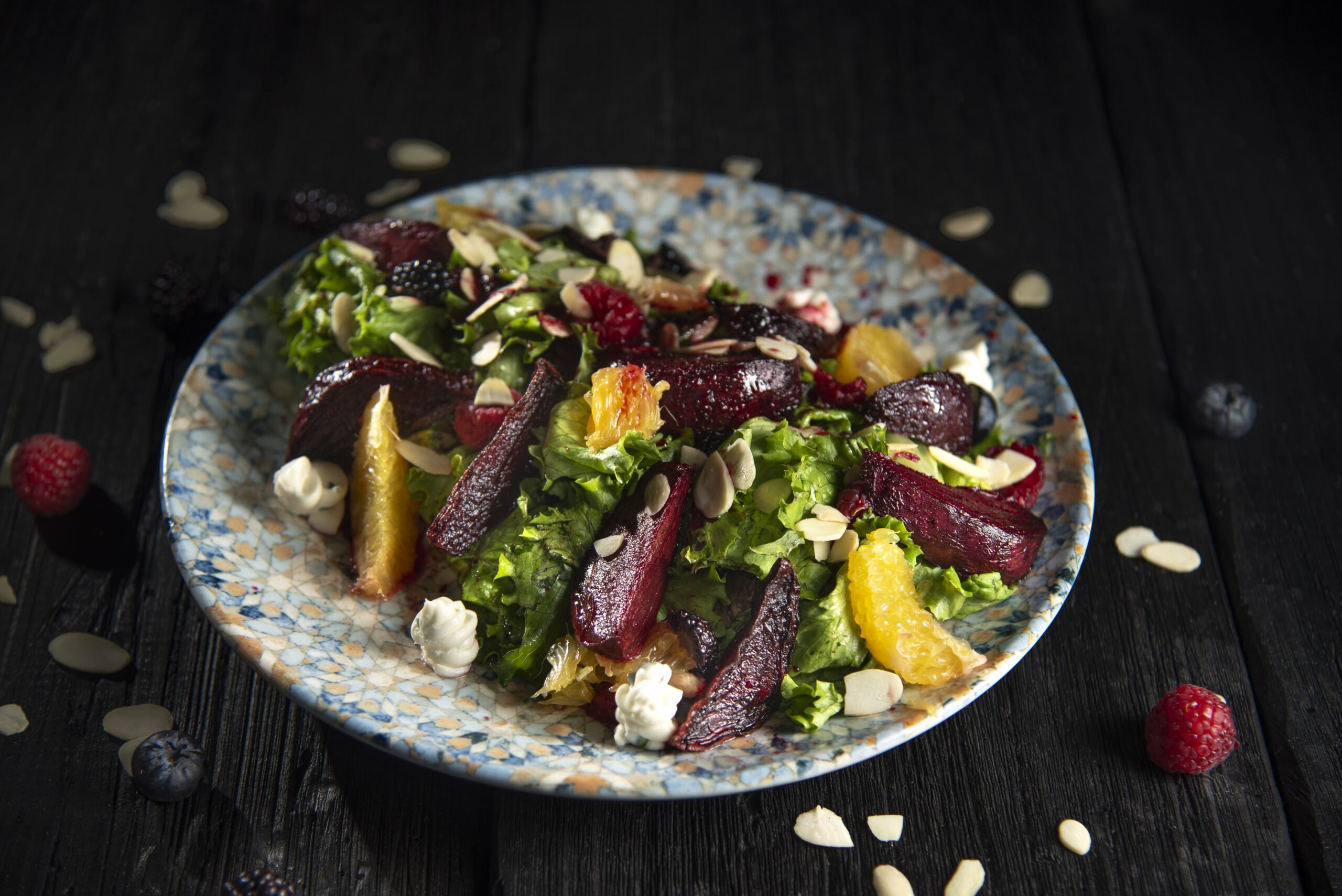 Mix de lechugas, betabel asado, supremas de naranja, almendra tostada y queso de cabra, acompañada de una vinagreta de jamaica y limón.