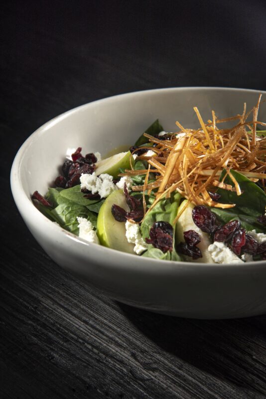 Mezcla de espinacas, arándanos, pera y queso de cabra, coronada con poro crocante, acompañada de aderezo de mostaza y miel.