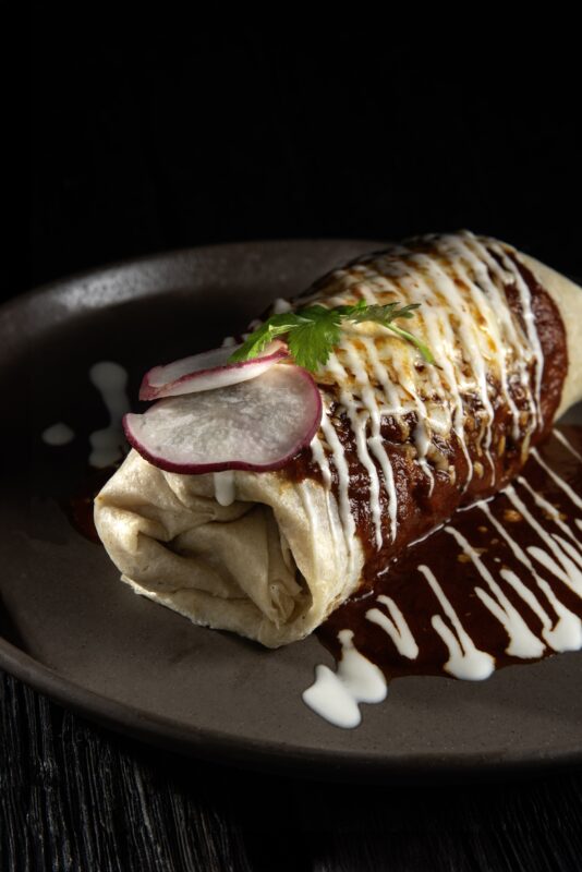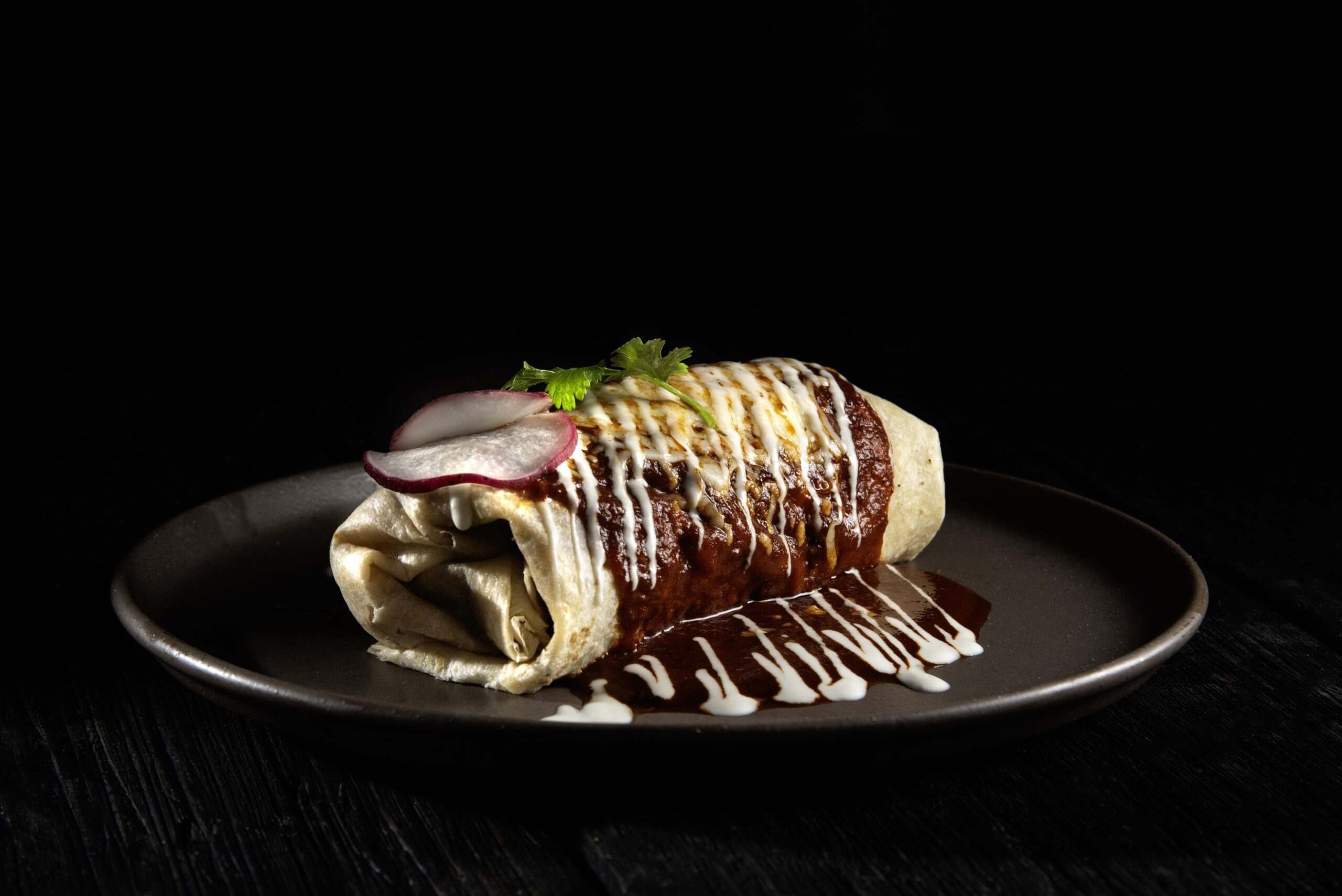 Tortilla de harina enrollada, rellena de pollo a la parrilla con salsa mexicana, arroz rojo, frijoles de olla, aguacate, crema, queso gouda gratinado, bañado en salsa roja, verde o brava.