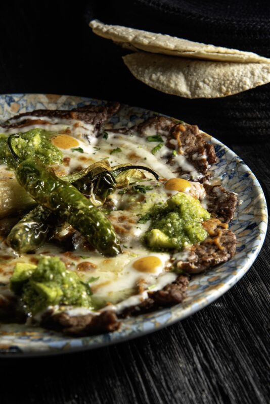 Sábana de filete de res, un toque de frijoles con longaniza, queso gratinado, toques ligeros de crema, chiles toreados y cebolla de cambray asada, se acompaña de aderezo de chipotle.